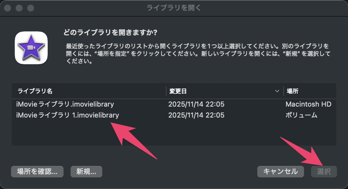 ウインドウが開くまで「optionキー」を押しっぱなしにしてiMovieを起動し、起動した画面で外付けSSD・HDDのiMovieライブラリを選択して「選択」をクリック