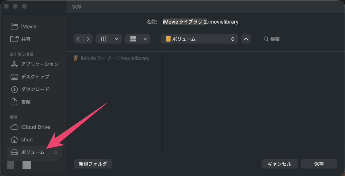 追記 一旦上記の方法で外付けSSD・HDDにiMovieのライブラリを作成した後は1〜5までの作業は不要 さらに、iMovieも「optionキー」押しっぱなしでの起動はせず、通常通りアイコンクリックで起動 「6. iMovieが開いたら画面上部の帯部分の、、、」から実施する。